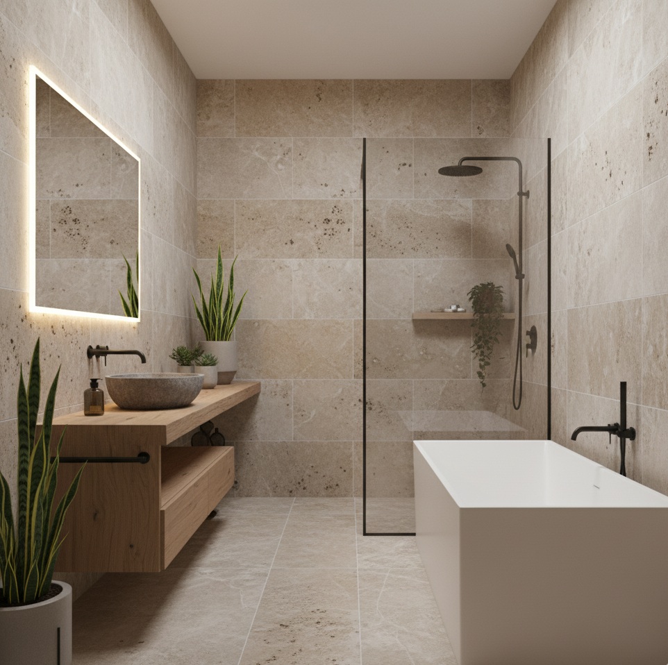 Travertin je porozni krečnjak, karakterističan po svojim prirodnim rupicama i toplim zemljanim tonovima, od bež i krem do svetlo smeđe. Njegova tekstura unosi dašak Mediterana i prirodne harmonije u svaki prostor.